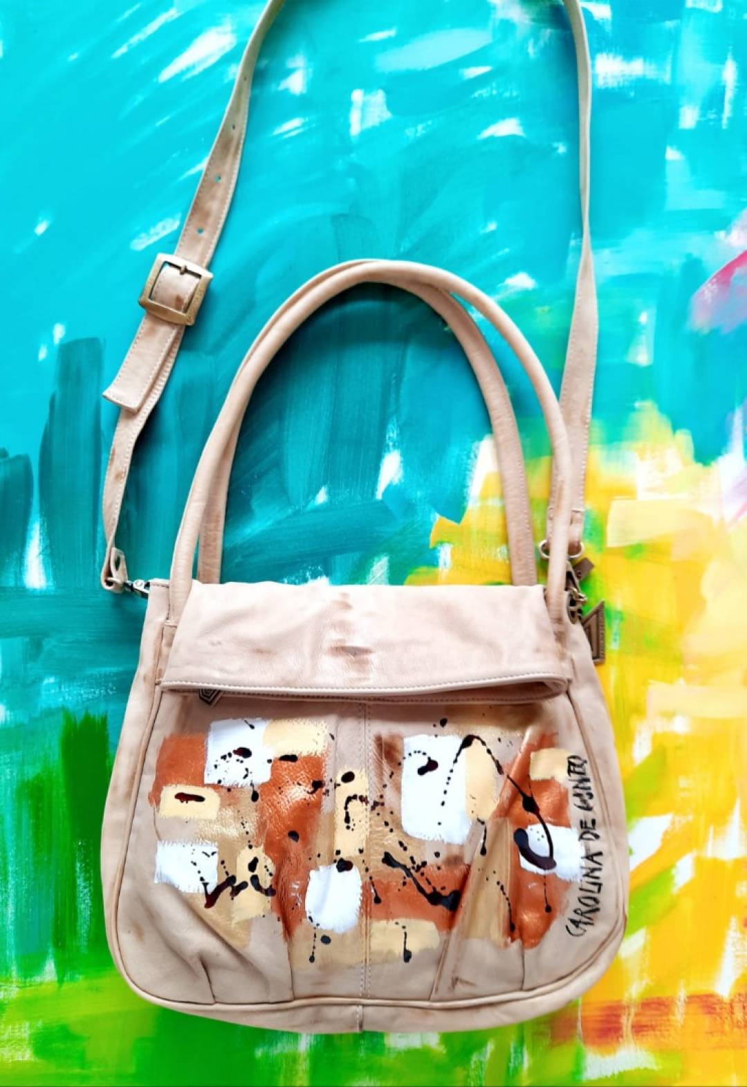 This is the most versatile handbag you can own, with many compartments. Soft leather bag wearable two ways, with short handles as a purse or long as a crossbody bag, top closure with flap makes this bag larger if needed. Hand painted art detail on front. Fully lined with Carolina's design pattern fabric.This is 100 % finished top quality, hand made selected bovine leather.