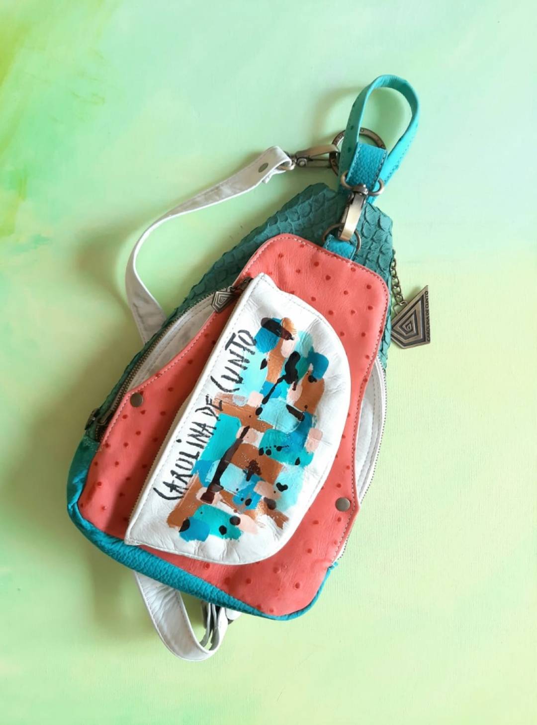 Elegant, extra soft leather bandolier. Combination of leathers and textures. Don´t miss the chance to glow! Perfect size and practicity combined with design. Handpainted art on pockets. Fully lined with Carolina's designed pattern fabric. This is a 100 % finished top quality.