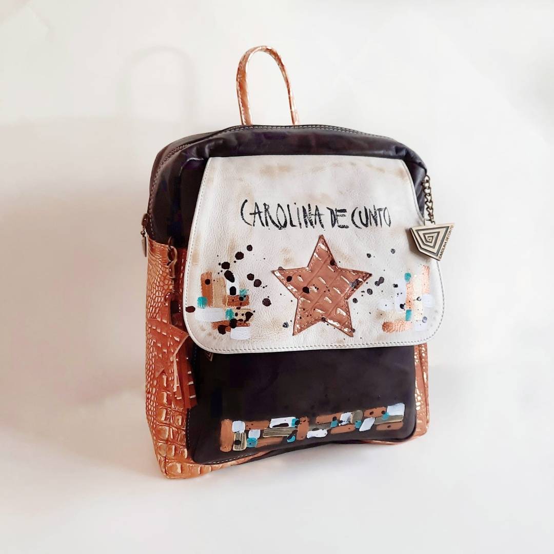 Elegant, extra soft leather backpack . Combination of leathers and textures. Don´t miss the chance to glow! Perfect size and practicity combined with design. Handpainted art on pockets. Fully lined with Carolina's designed pattern fabric. This is a 100 % finished top quality, handmade selected bovine leather.