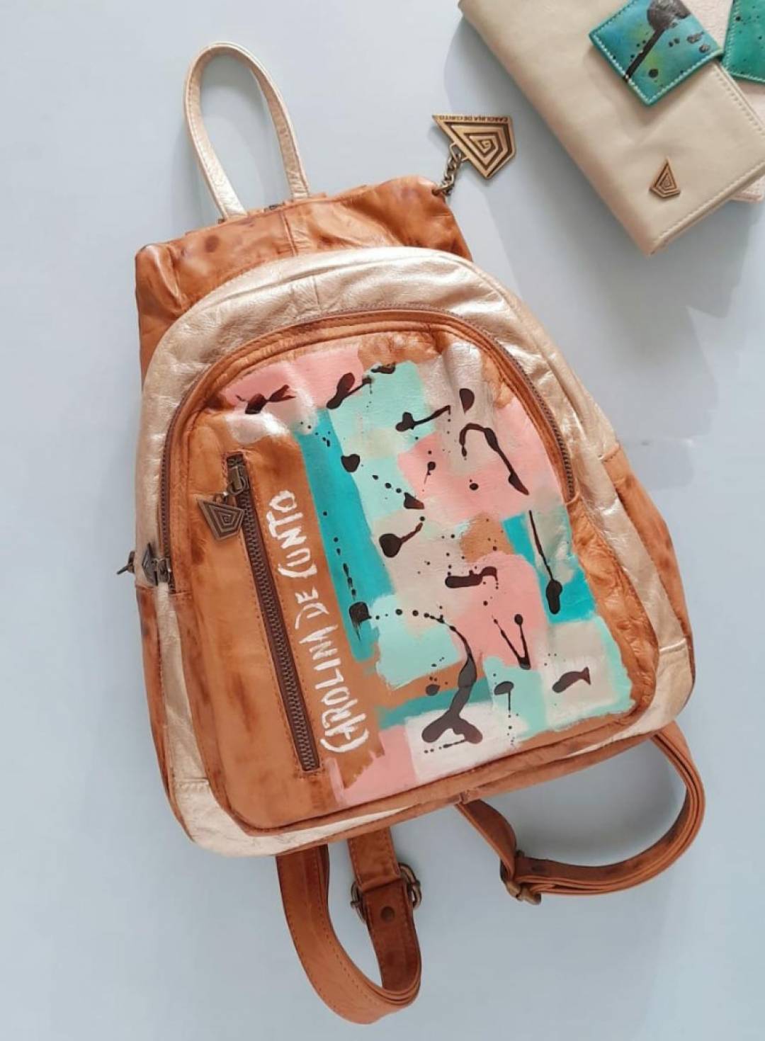 Elegant, large, extra soft leather backpack. Don´t miss the chance to glow! Gold leather, with a touch of black patent. Prefect size and practicity combined with design. Handpainted art on pockets. Fully lined with Carolina's designed pattern fabric. This is a 100 % finished top quality, handmade selected bovine leather.