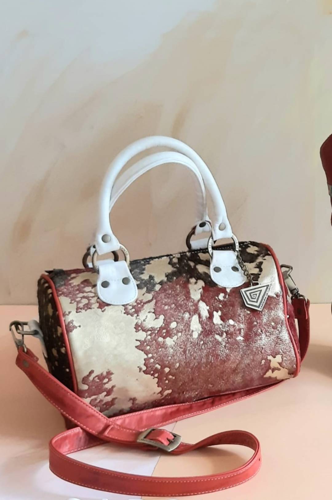 Show your attitude with this audacious combination of texture and color. Stylish and trendy handbag. Wear it casual as a cross body or short by the waist. Fully lined with Carolina's design pattern fabric. This is 100 % finished top quality, handmade selected bovine leather.