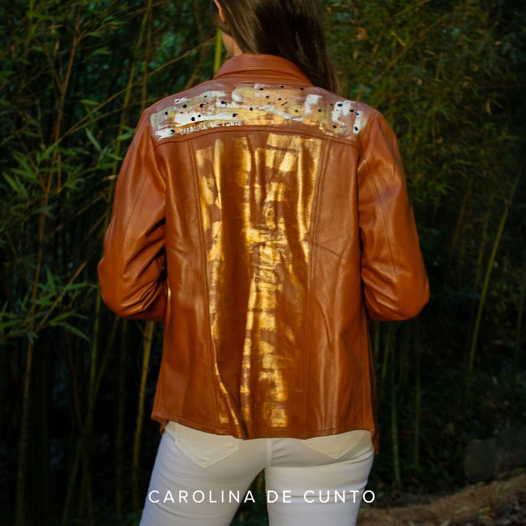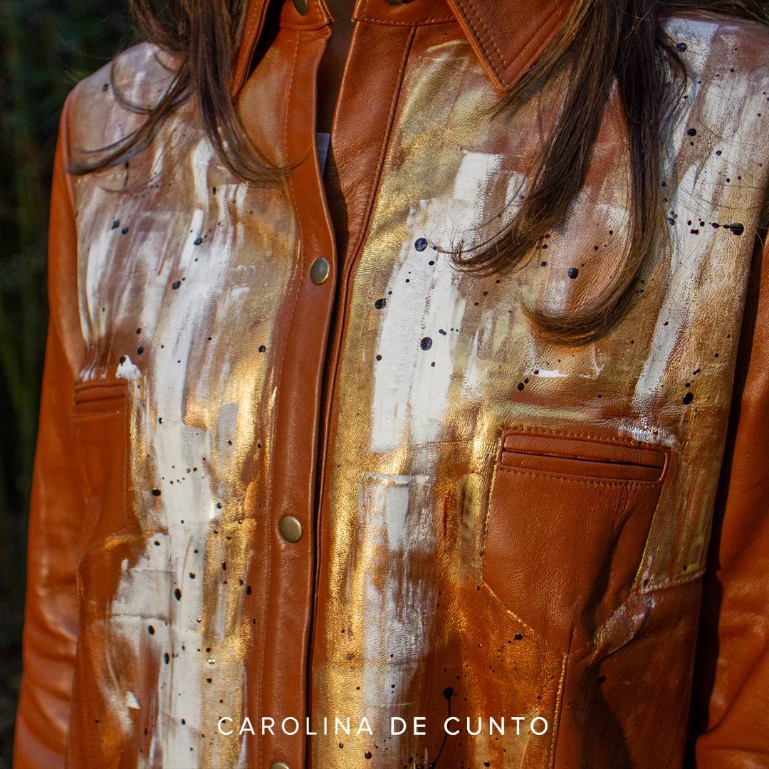 Art to wear. Elegant leather shirt in caramel color hand painted by Carolina de Cunto. Handmade with selected Uruguayan leathers of superior quality.