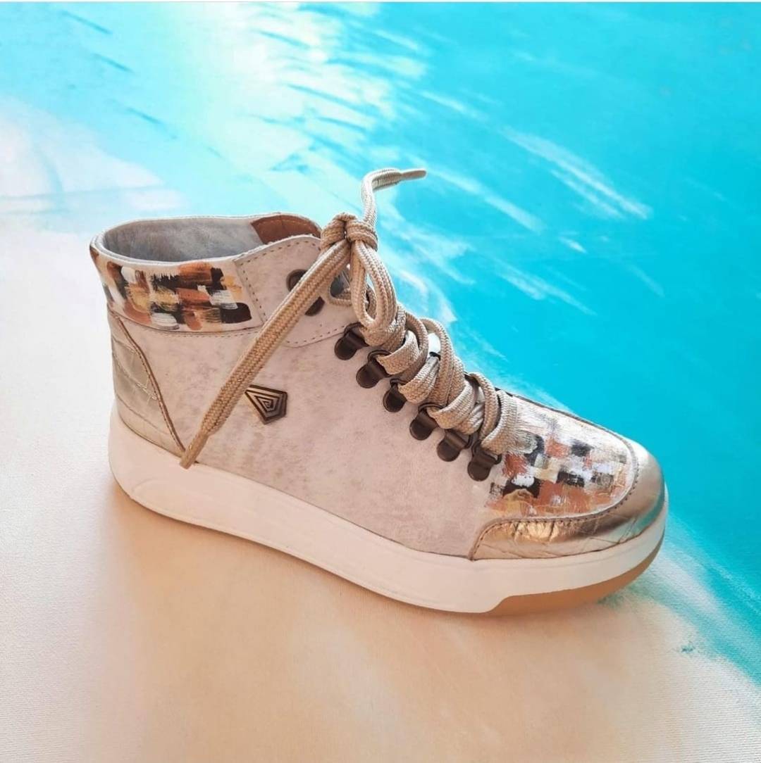 -Color: Gold textured leather sneakers. Art detail made by Carolina.