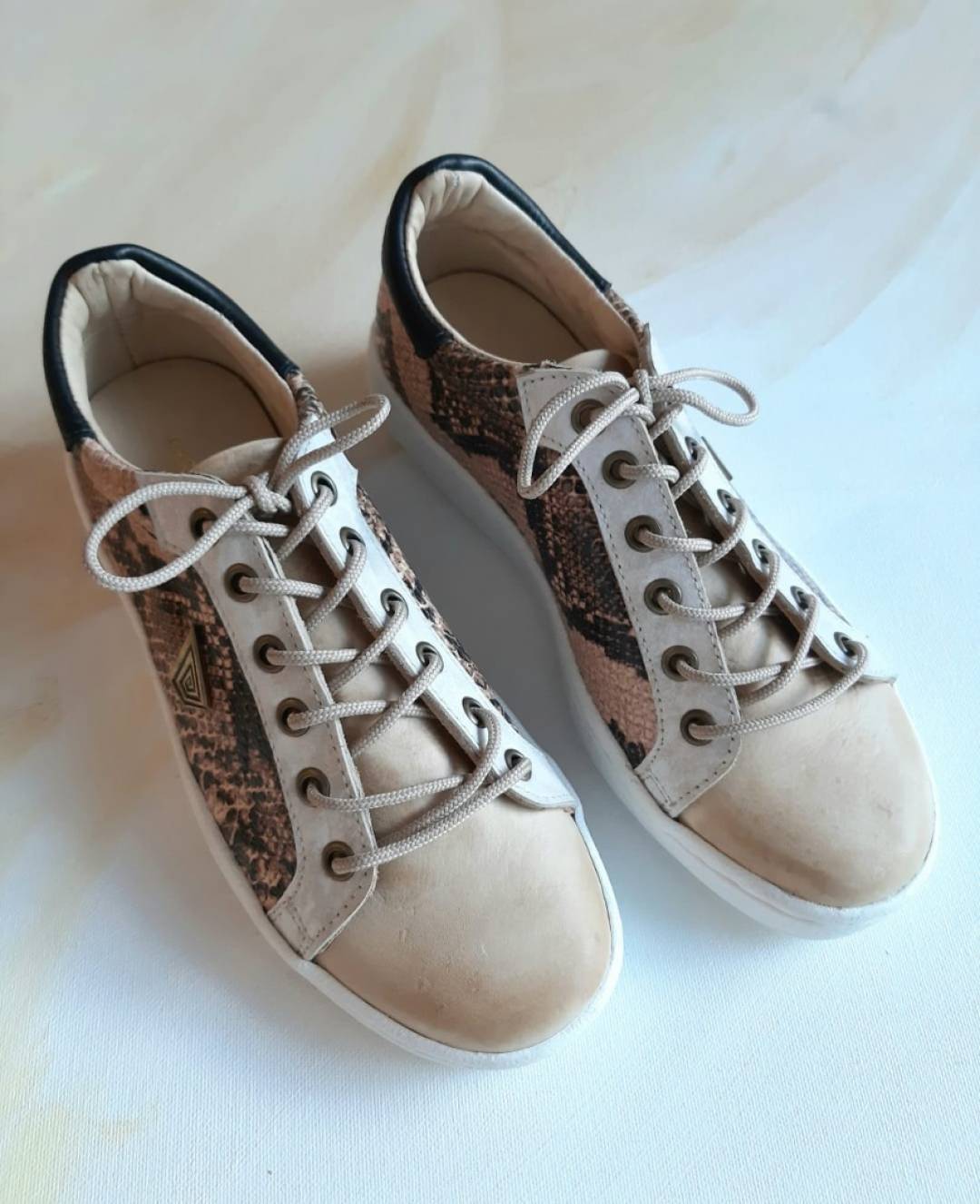 -Color: Gold textured leather sneakers. Art detail made by Carolina.
