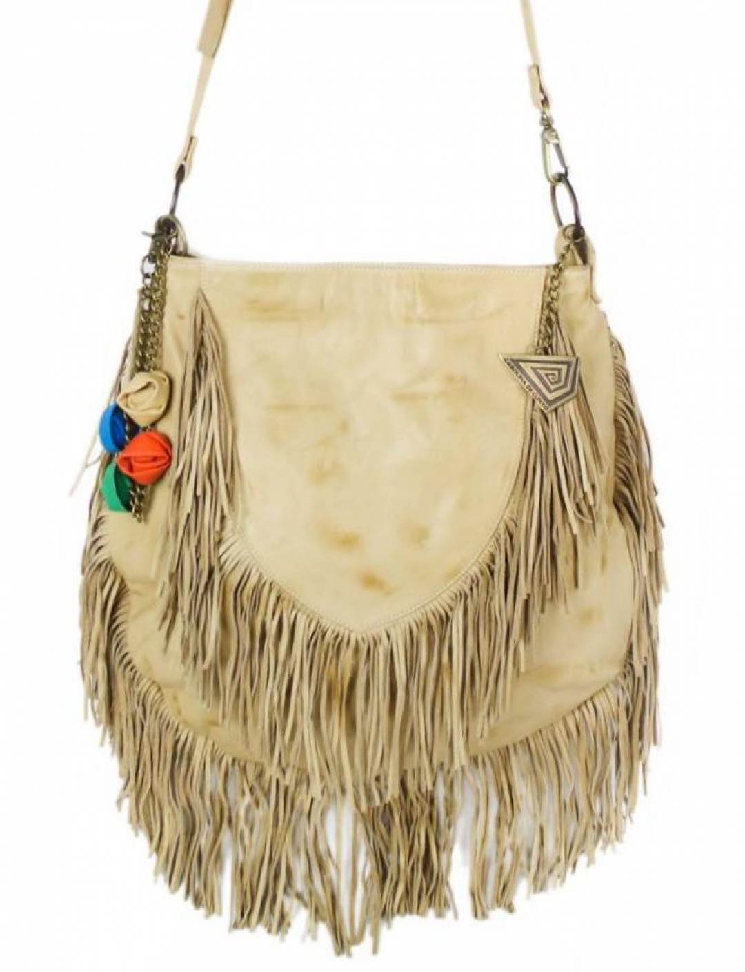 - Available color: Finished ivory leather with tan patina, fringes in same color and colorful flower tassel.