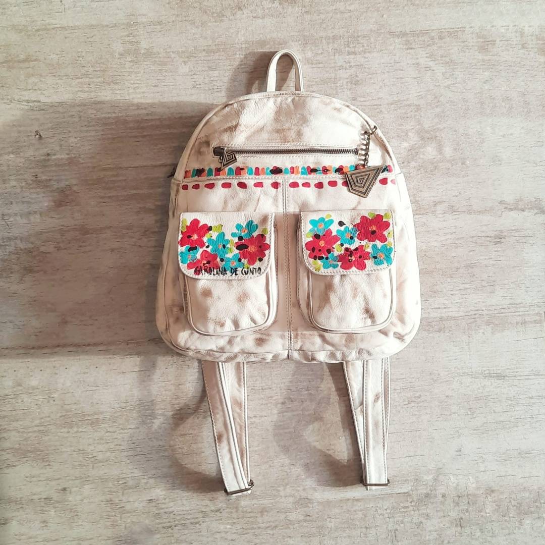 Don't miss this round design leather backpack in extra soft leather. Many pockets in different sizes. Flap for pockets in the front gives this backpack elegant wear. Fully lined with Carolina's design pattern fabric. This leather backpack is 100 % finished top quality, handmade selected bovine leather.