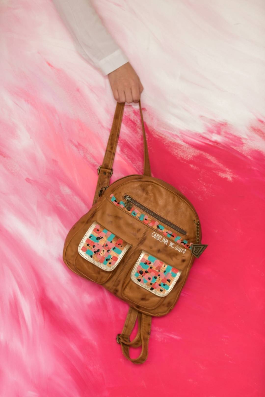 Don't miss this round design leather backpack in extra soft leather. Flap for pockets in the front gives this backpack elegant wear. Fully lined with Carolina's design pattern fabric. This leather backpack is 100 % finished top quality, handmade selected bovine leather.