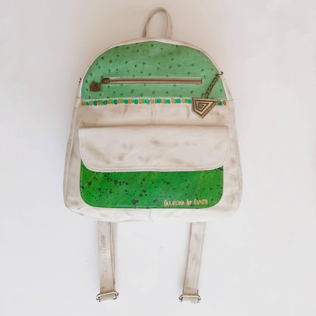 Elegant, extra soft leather backpack . Combination of leathers and textures. Don´t miss the chance to glow! Perfect size and practicity combined with design. Handpainted art on pockets. Fully lined with Carolina's designed pattern fabric. This is a 100 % finished top quality, handmade selected bovine leather.