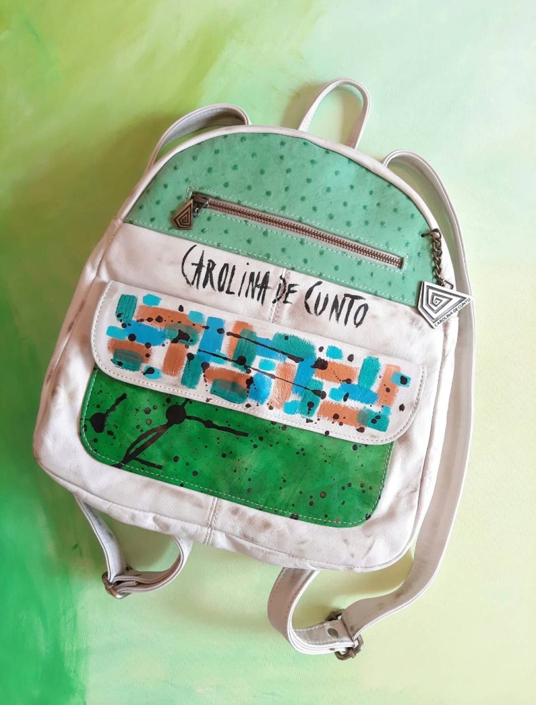 Elegant, extra soft leather backpack . Combination of leathers and textures. Don´t miss the chance to glow! Perfect size and practicity combined with design. Handpainted art on pockets. Fully lined with Carolina's designed pattern fabric. This is a 100 % finished top quality, handmade selected bovine leather.