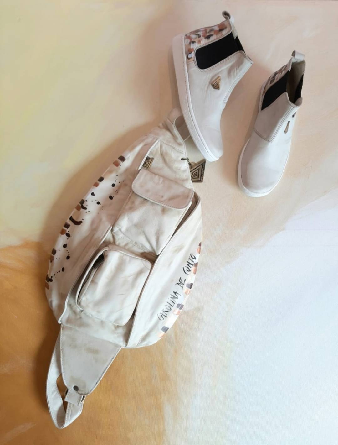 Elegant, extra soft leather bandolier. Combination of leathers and textures. Don´t miss the chance to glow! Perfect size and practicity combined with design. Handpainted art on pockets. Fully lined with Carolina's designed pattern fabric. This is a 100 % finished top quality.