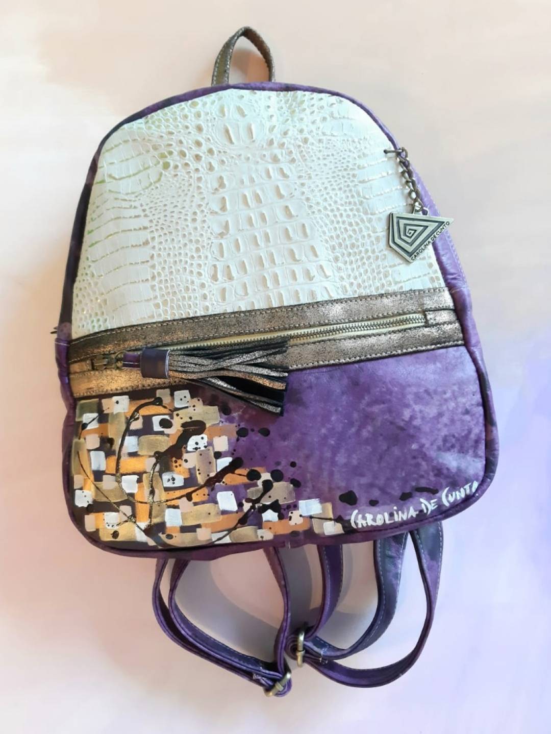 Elegant, extra soft leather backpack . Combination of leathers and textures. Don´t miss the chance to glow! Perfect size and practicity combined with design. Handpainted art on pockets. Fully lined with Carolina's designed pattern fabric. This is a 100 % finished top quality, handmade selected bovine leather.
