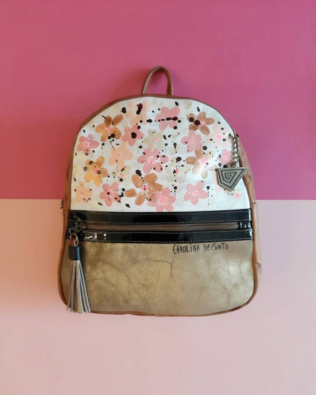 Elegant, extra soft leather backpack . Combination of leathers and textures. Don´t miss the chance to glow! Perfect size and practicity combined with design. Handpainted art on pockets. Fully lined with Carolina's designed pattern fabric. This is a 100 % finished top quality, handmade selected bovine leather.