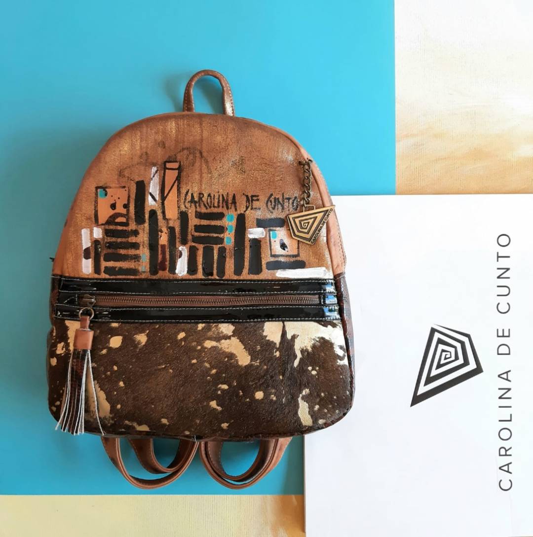 Elegant, extra soft leather backpack . Combination of leathers and textures. Don´t miss the chance to glow! Perfect size and practicity combined with design. Handpainted art on pockets. Fully lined with Carolina's designed pattern fabric. This is a 100 % finished top quality, handmade selected bovine leather.