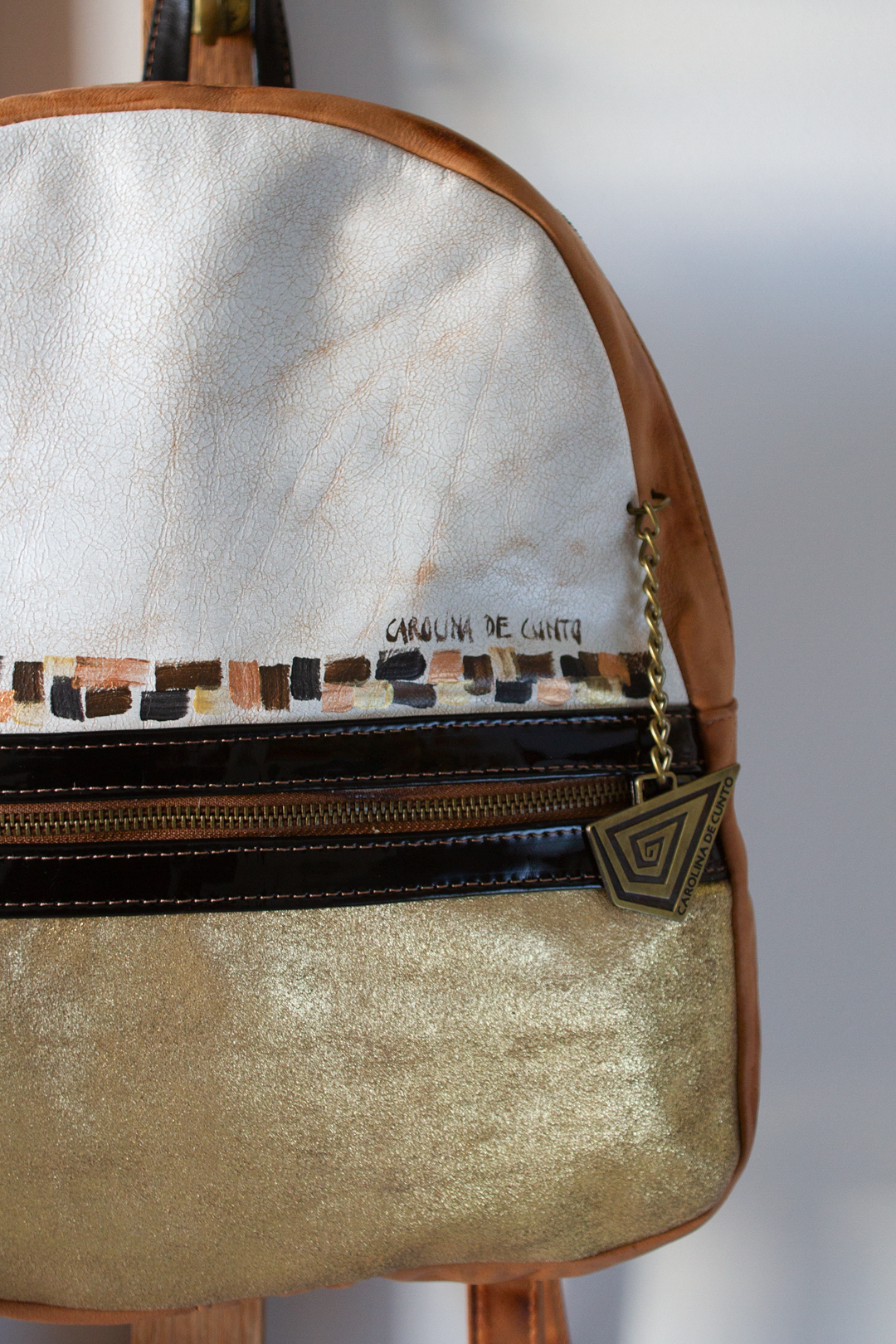 Elegant, extra soft leather backpack . Combination of leathers and textures. Don´t miss the chance to glow! Perfect size and practicity combined with design. Handpainted art on pockets. Fully lined with Carolina's designed pattern fabric. This is a 100 % finished top quality, handmade selected bovine leather.