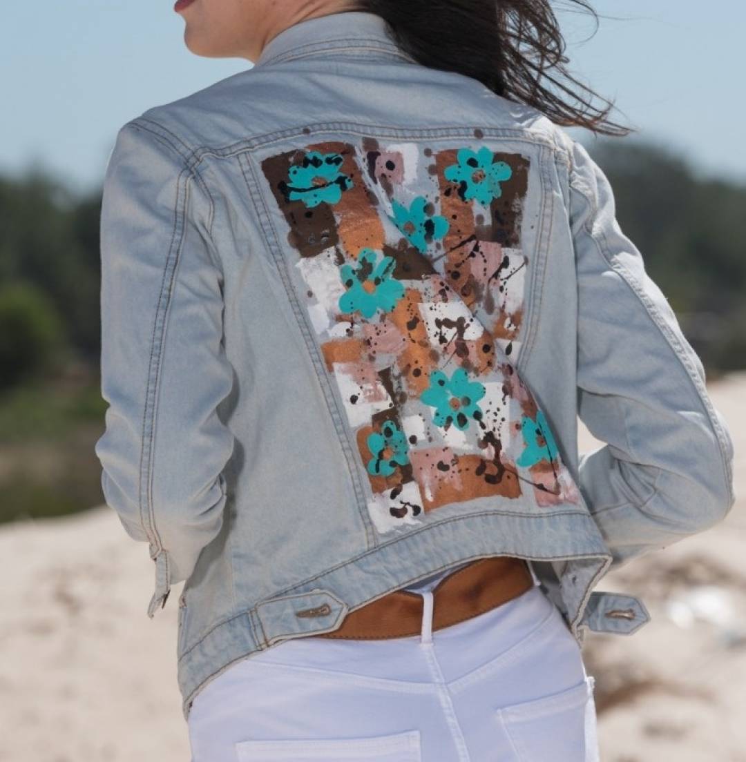 Art to wear. Jeans jacket with handmade art by Carolina De Cunto. Joviality and style in a garmet.