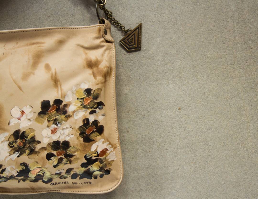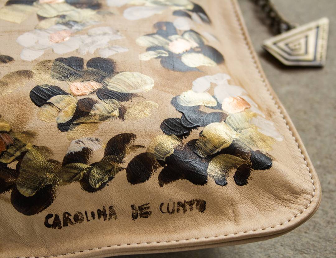 - Available color: Finished ivory color bag with tan patina leather, hand painted flowers made by Carolina.